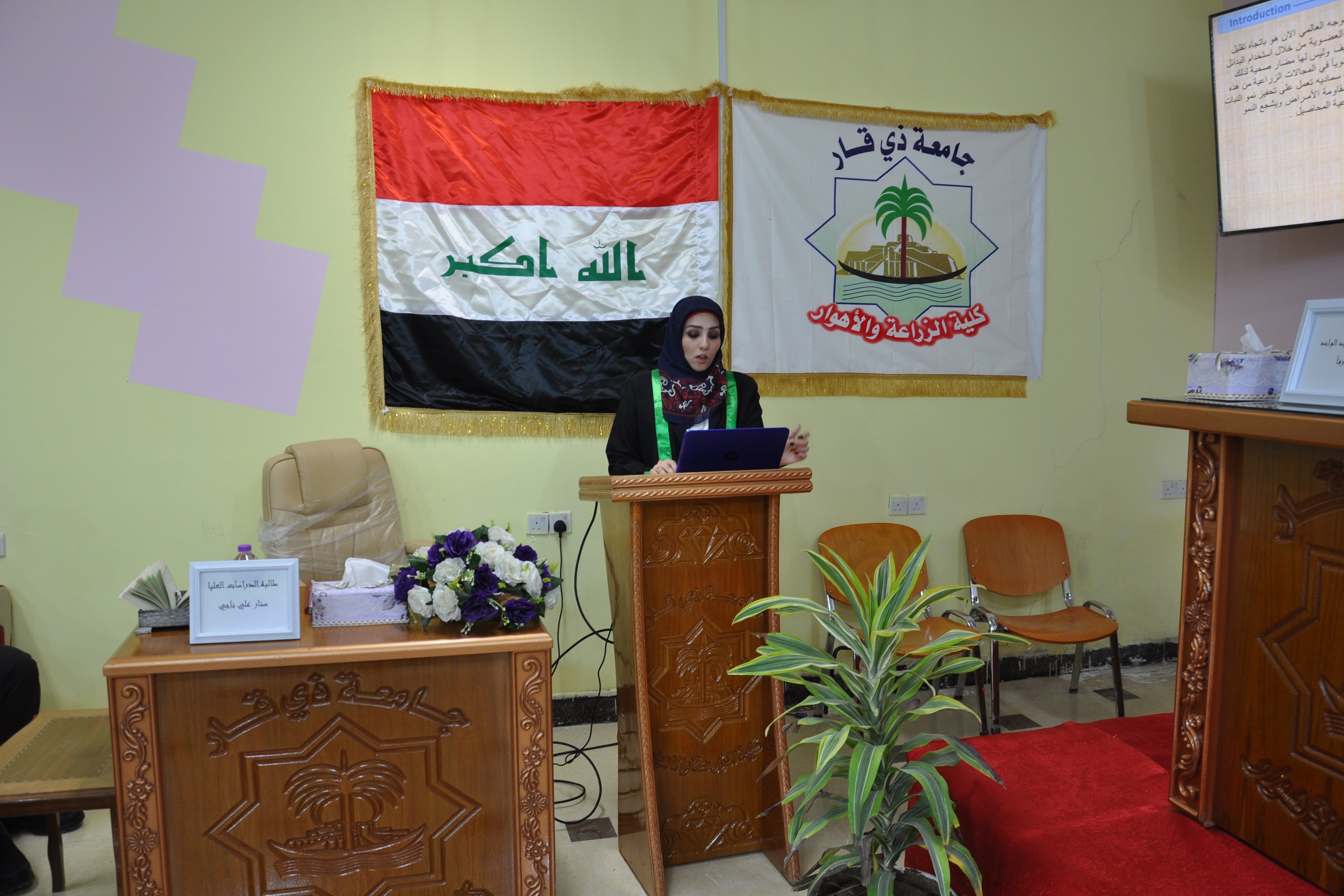 اقامت كلية الزراعة والاهوار بجامعة ذي قار مناقشة طالب الدراسات العليا/ الماجستير ( سنار علي ناجي ) حيث كان عنوان الرسالة الموسومة (( تاثير الرش الورقي بمستخلص الطحالب البحرية في نمو وحاصل وقوة بذور اربعة اصناف من الباقلاء)) بحضور الاستاذ الدكتور علي محمد الحسني من جامعة المثنى وحضور رؤساء الاقسام العلمية في الكلية وتدرسيها ونخبة من موظفين ومهندسي مديرية زراعة ذي قار وكذلك حضور طلبة الدراسات العليا في كليتنا وجرت على بركة الله مناقشة طالب الدراسات العليا / الماجستير ( سنار علي ناجي ) في صباح يوم الثلاثاء الموافق 19/3/2019 في تمام الساعة التاسعة والنصف على قاعة النخيل في كلية الزراعة والاهوار / جامعة ذي قار وكانت لجنة المناقشة تتالف من الذوات المدرجة ادناه :