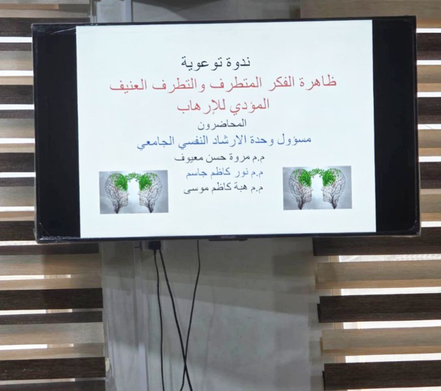 حاضر في الندوة كل من م. م. مروة حسن معيوف وم. م. نور كاظم جاسم وم. م. هبة كاظم موسى، إذ تم تناول مفهوم التطرف الفكري من الجوانب الفكرية والقانونية والإعلامية ،وبيان أهمية نشر ثقافة التسامح والوعي الفكري بين الشباب وتسليط الضوء على دور المؤسسات التعليمية للحد من هذه الظاهرة .