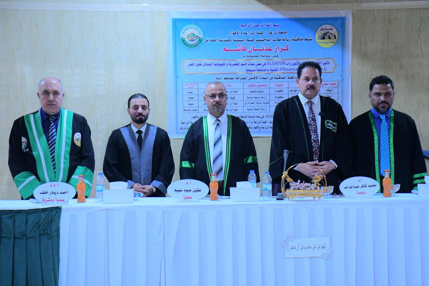 ناقشت كلية الزراعة والأهوار بجامعة ذي قار رسالة ماجستير للطالب كرار عدنان هاشم الحجامي من قسم البستنة وهندسة الحدائق، والتي تناولت دراسة تأثير إضافة الكلايكول متعدد الأثلين (PEG) والرش بمستخلص الطحالب البحرية (Algatone 20) في بعض الصفات الخضرية والكيميائية لفسائل نخيل التمر صنف البرحي المنتجة بتقنيات الزراعة النسيجية.