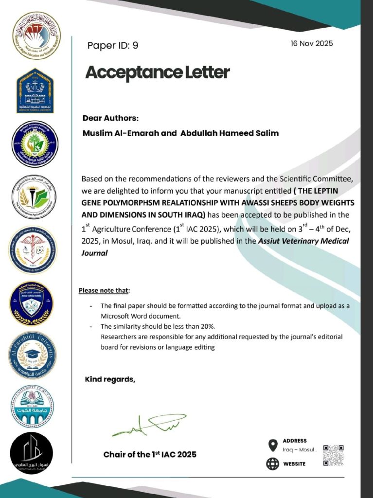شارك التدريسيان من قسم الإنتاج الحيواني في كلية الزراعة والأهوار، أ. د عبدالله حميد سالم و أ. م. د مسلم خيري ناجي، في المؤتمر الدولي للعلوم الزراعية الذي نظمته الجامعة التقنية الشمالية في محافظة نينوى يومي 3 و4 كانون الأول.